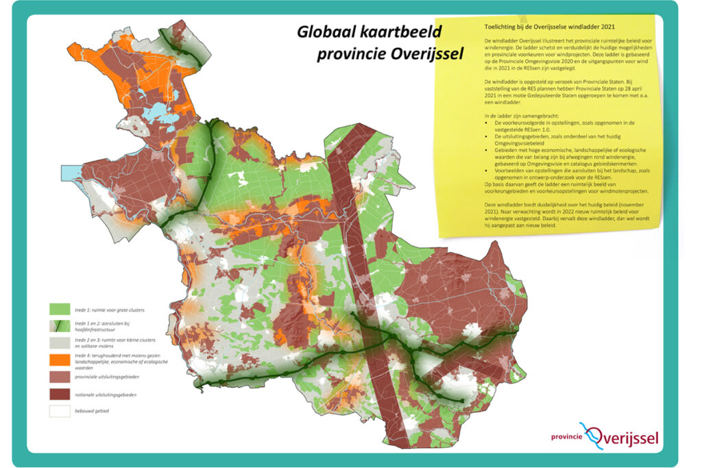 De windladder Overijssel illustreert het provinciale ruimtelijke beleid voor windenergie. De ladder schetst en verduidelijkt de huidige mogelijkheden en provinciale voorkeuren voor windprojecten. Deze ladder is gebaseerd op de Provinciale Omgevingsvisie 2020 en de uitgangspunten voor wind die in 2021 in de RES-sen zijn vastgelegd.