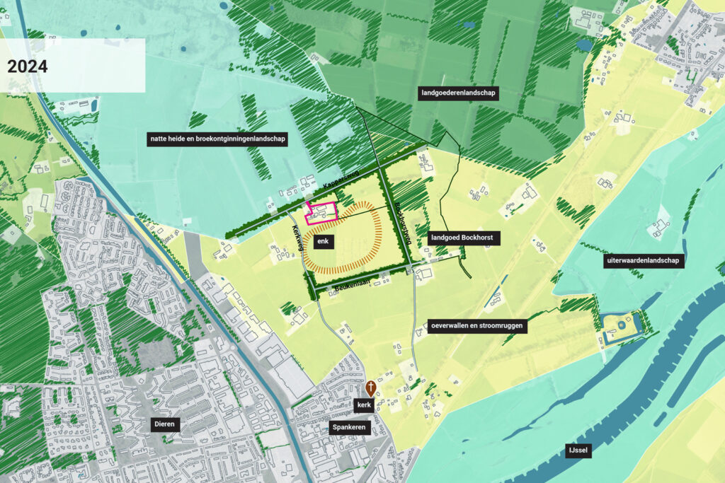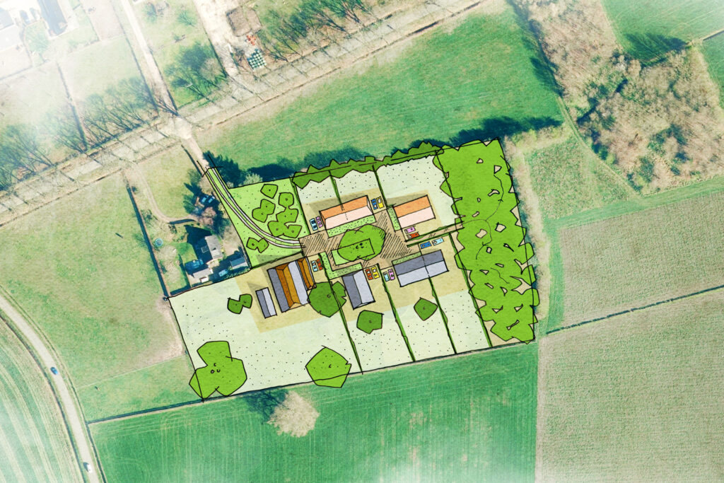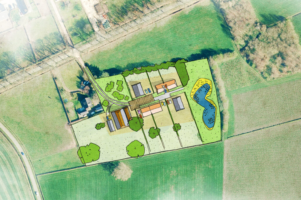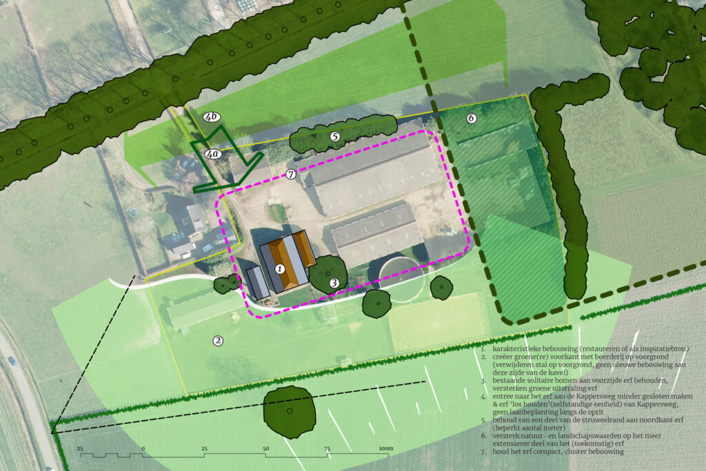 Voor een erf gelegen aan een enk in de gemeente Rheden is een variantenstudie opgesteld. Vanuit een beknopte landschappelijke analyse en uitgangspunten zijn twee schetsen gemaakt voor een nieuwe invulling van het erf na sloop van ca. 2800m².